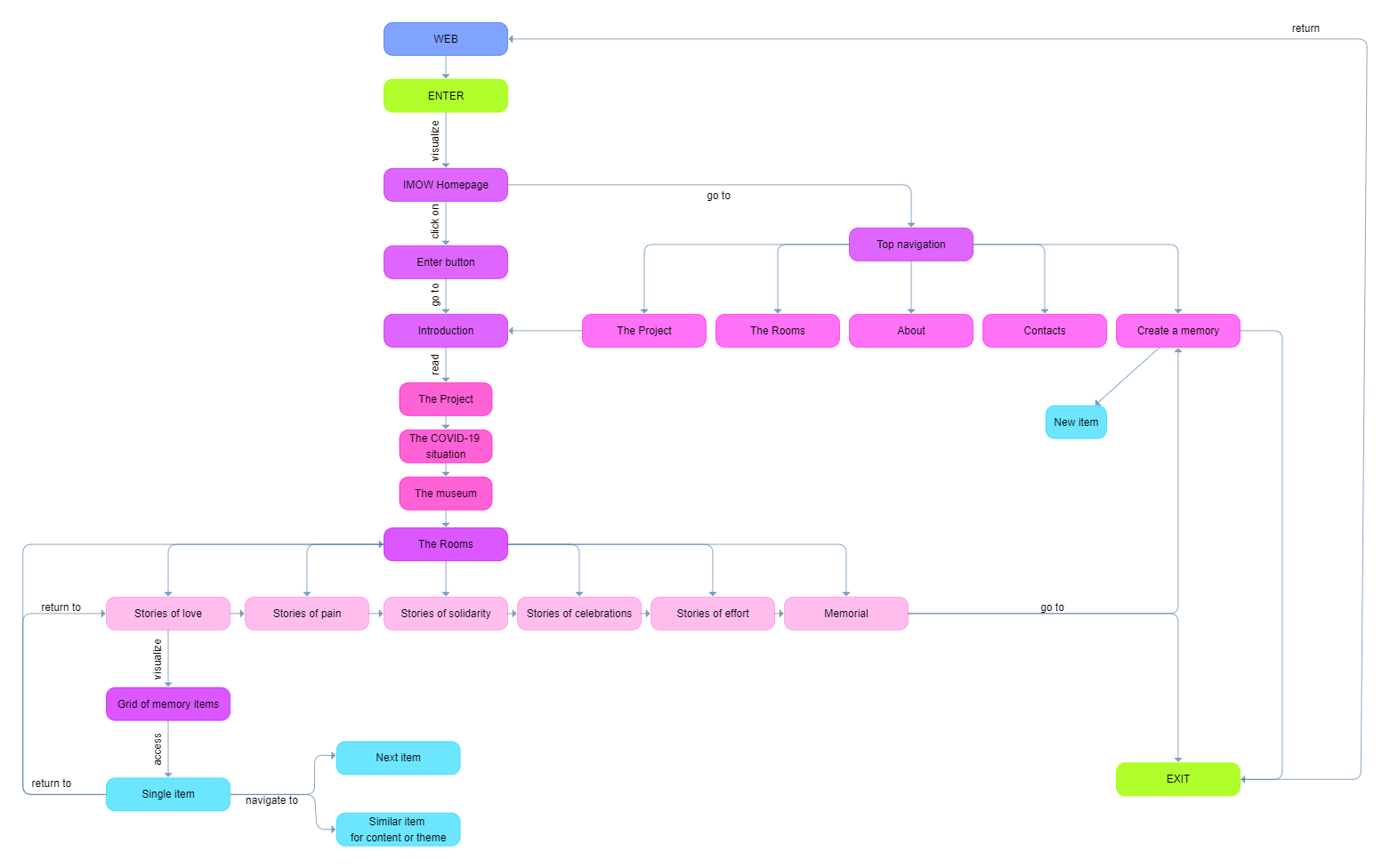 IMOW is a virtual gallery that doesn’t necessarily stand in the common perception of museum. It is not an experimental museum, since the gallery, the rooms and the contribution system are familiar enough to both the public and the scholars. IMOW has an hybrid identity between a museum and a public diary. Interaction, at least for the initial phase after basic development, is limited to contribution and approachability of the IMOW team. It has no strictly guided itinerary apart from the "related content" system. IMOW is freely browsable by any user without subscription to the museum.